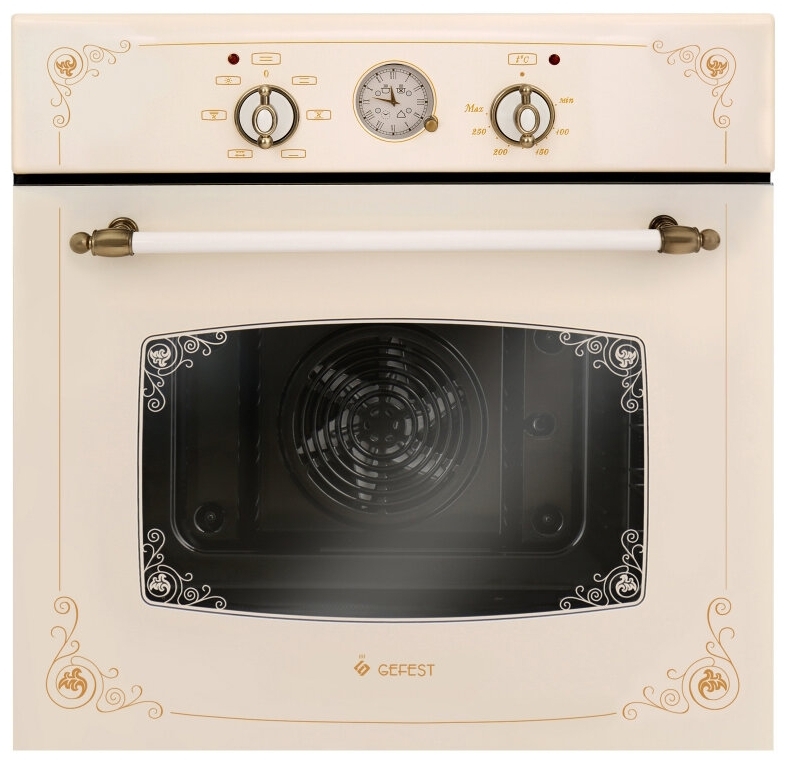 Электрический духовой шкаф с фасадом, покрытым эмалью кремового цвета. Дополнительно нанесен рисунок, декорирующий фасад в ретро-стиле, выступающие ручки также декорированы. В середине панели управления расположен аналоговый циферблат с часами и встроенным таймером. Внутреннее освещение - двухточечное, размещенное на противне блюдо прекрасно видно сквозь двойное стекло дверцы, нет необходимости открывать ее, выпуская жар. Съемные направляющие для облегчения ухода за стенками шкафа. Классический термостатированный нагрев, конвекция работает в режиме гриля, значительно ускоряя разогрев духовки и позволяя готовить на нескольких уровнях одновременно.