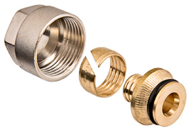 Латунный фитинг с накидной гайкой и обжимным кольцом для подключения металлополимерной трубы к коллектору с выходами диаметром ?", стандарт соединения – «евроконус».