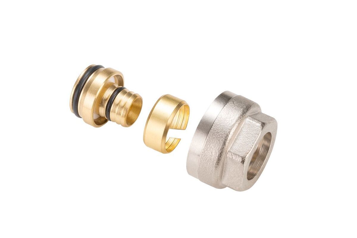 Латунный фитинг с накидной гайкой и обжимным кольцом для подключения металлополимерной трубы к коллектору с выходами диаметром ?", стандарт соединения – «евроконус».