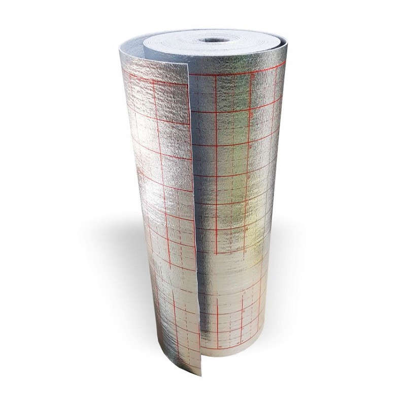 Отражающая высокоплотная подложка "GLOBEX" 3 мм с разметкой специально разработана для систем водяного/кабельного отопления под стяжку и обладает свойствами вибродемпфирующей шумоизоляционной прокладки.