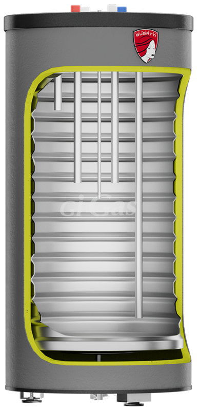 Бойлер Federica Bugatti Eco сконструирован по схеме: внутренний бак бойлера (контур горячего водоснабжения (далее ГВС) с водяной рубашкой (контур обогрева бойлера через систему отопления (далее СО). Для увеличения прочности, стенки внутреннего бака имеют вальцовку, создающую ребра жесткости. Дно бойлера двойное, что увеличивает производительность бойлера и устраняет зону непрогретой воды внизу бака.