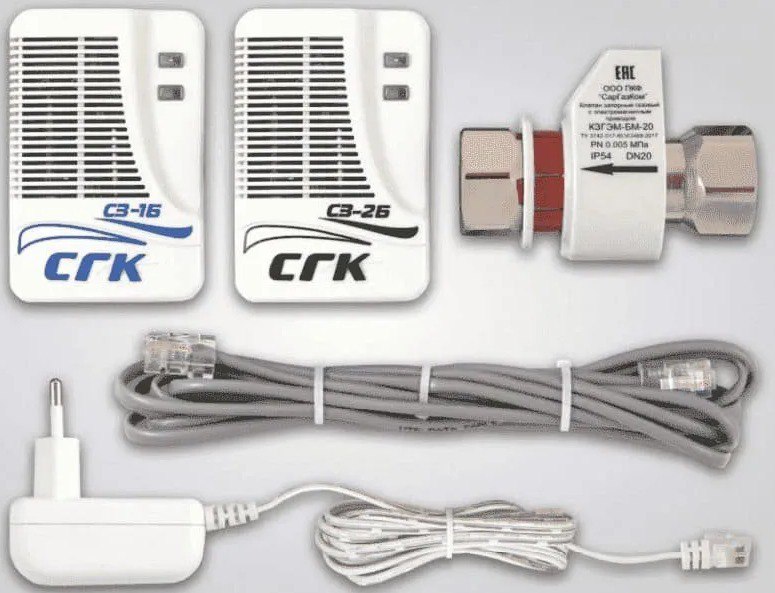 В комплект системы САКЗ-МК-2 входит сигнализатор СЗ-1 (природный газ)/ СЗ-3 (сжиженный газ), СЗ-2 (оксид углерода), блок БСУ, клапан КЗЭУГ или КЗГЭМ-У (DN = 15?150, PN — до 0,4 МПа), кабелm с разъемами длиной 10 метров (по заказу возможна иная длина). По заказу система комплектуется пультом контрольным ПК для передачи сигналов в другое помещение.