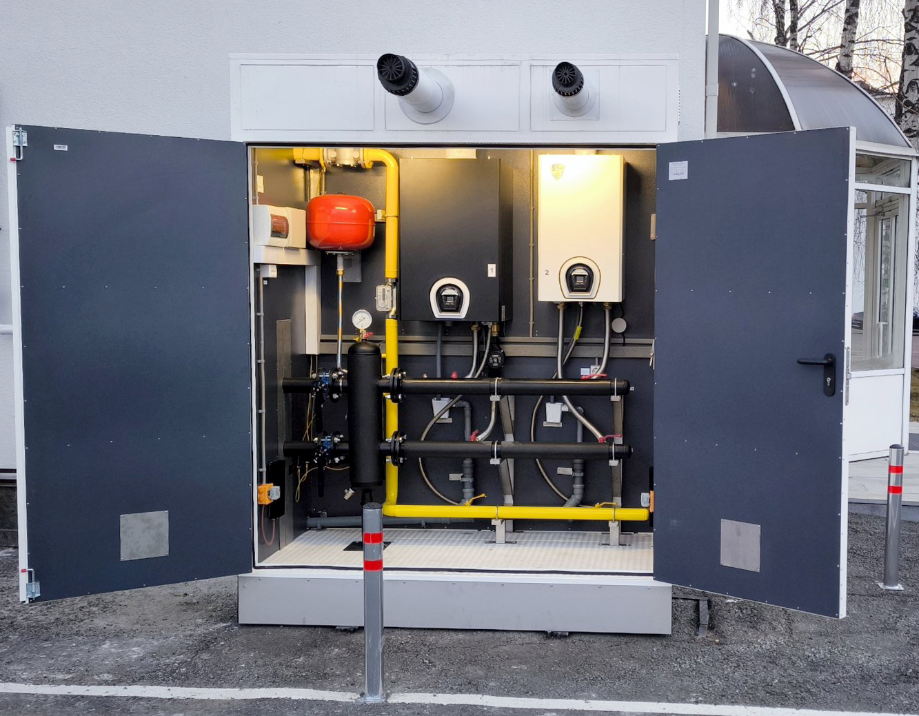В котельной установлено два конденсационных котла Federica Bugatti на 65 кВт и 99 кВт, а также все необходимое оборудование.